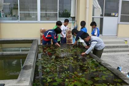 薄着で遊ぶ子、草むらで虫を見つける子、そして、観察池に手をいれて水中の生物を探る子など・・・