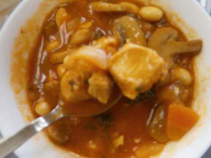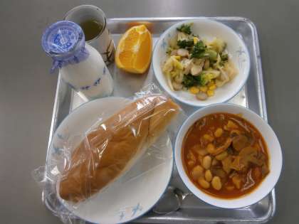 大豆たっぷりのチキンビーンズ(写真中)は、ちょっと苦手な人もいたようですが、パセリが入りとてもよい風味がしていました。デザートに、4分の1カットのオレンジもつきました。