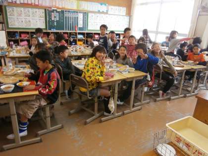 教室へ行ったら、、楽しそうに給食の時間を過ごしていました。(写真下)