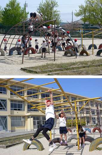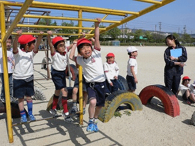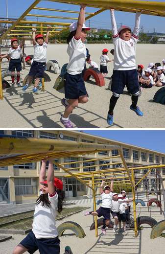 4月19日(金)の5時限、体育の授業で2年1組(担任:井戸教諭)の子どもたちが楽しそうに遊具で運動をしています。