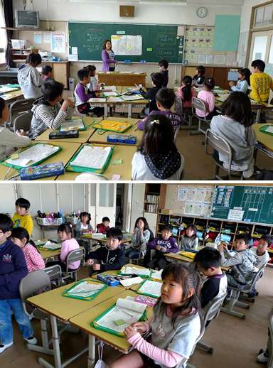 「校区探検」から帰ってきた3年生は1組(担任:都築教諭)も2組(担任:福井教諭)も、3時限にそれぞれの教室で「見つけたこと、調べたこと」を発表しました。(画像は1組の授業のようすです)