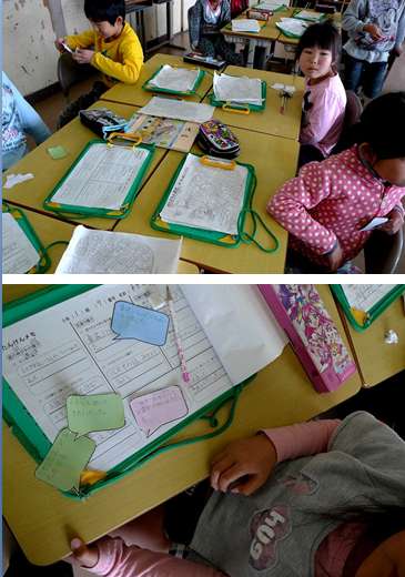 子どもたちは、探検で見つけたことを「道路の両側のようす」、「交通のようす」、「土地のようす」、「そのほか」の4つの観点にわけて、それぞれをピンク、みどり、黄、青の4色に分けしたカードに書き込みました。