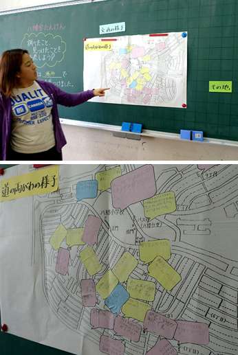 そして、順番に自分のカードを大きな地図にはりつけて、話し合いをしました。