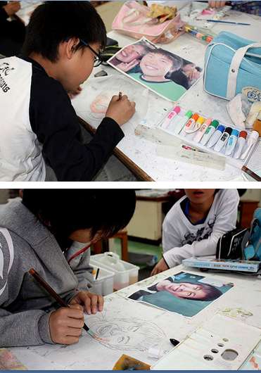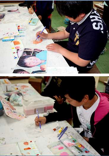 子どもたちは自分の写真をもとに、トレーシングペーパーに下絵を描いた後、水彩絵の具の「赤」「青」「黄」「白」「こげ茶」の5つだけを使って着色しました。