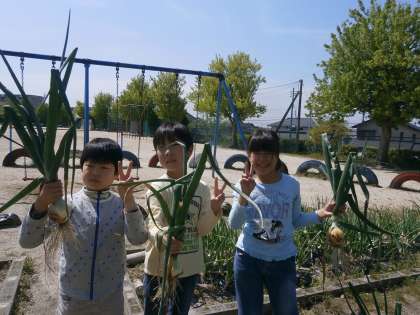 メニューは、カレーライスとサラダ。初めに、カレーとサラダで使う玉ねぎを自分たちの畑から収穫しました。6月16日の日曜学級で販売する予定ですが、もう食べ頃な大きさのものもできていました。とれたての玉ねぎは、つやつやで切り口から汁が出てきます。