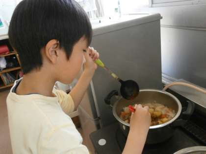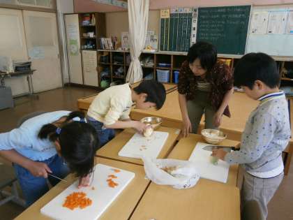 調理実習は、今までの経験もあり包丁を安全に使うことができました。いつもなら、カレー、サラダができあがったら、ご飯を炊けるのを待つだけですが、今日はこれからが本番です。