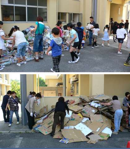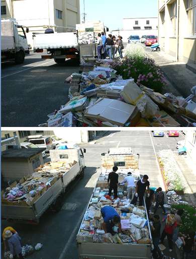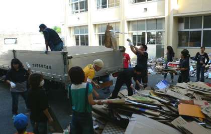 5月14日(火)の朝、第1回目のストック回収が行われました。「光陵中学校の収集と重なる・・・」ということで、校内にストックされた資源物を業者さんに回収していただきました。