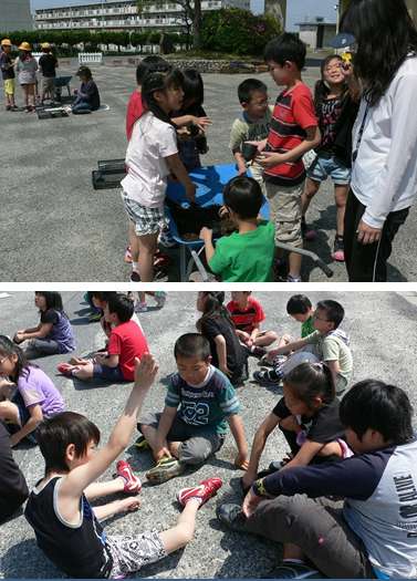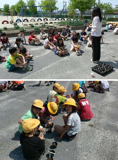 子どもたちは担任の指示を聞いて、ポットに「ヒマワリ」、「ホウセンカ」「ピーマン」、「ワタ(綿)」4種類のたねをまきました。