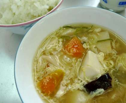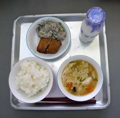 「ひじきサラダ」は、ひじきをはじめ、オイルツナがほうれん草やえだまめなどの野菜といっしょに豆腐マヨネーズや練りごまであえて、子どもたちにも食べやすいように,アレンジしてあります。