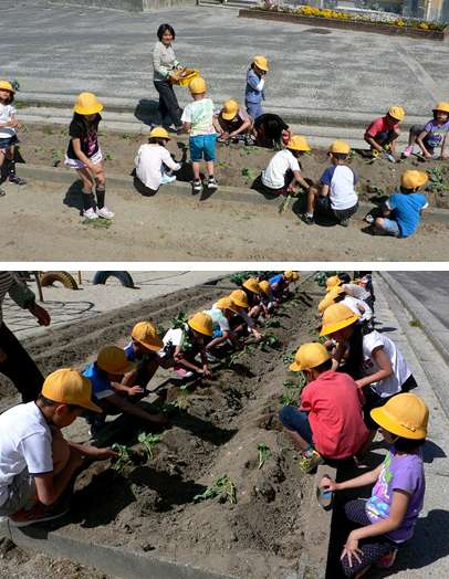 5月17日(金)の1時限、2年2組(担任:古田教諭)の子どもたちが生活科の学習「ぐんぐん そだて みんなのやさい」で、学級園にサツマイモの苗を植えました。