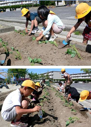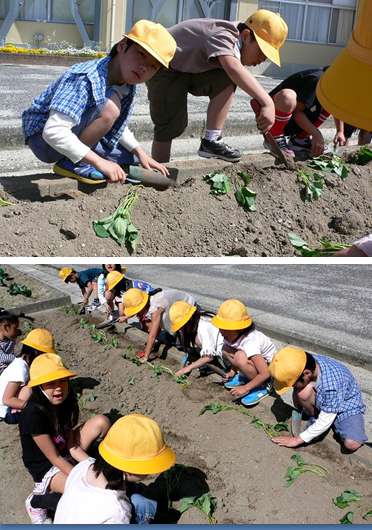 古田教諭の指示にしたがって、ちょうどよい深さの穴をほり、やさしく、そっと苗を植えました。