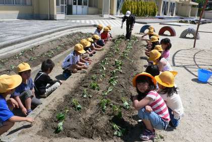 サツマイモの苗を植え、ペットボトルじょろでたっぷりの水をあげたら、ネームプレートをつくって、世話をする苗のところにさします。
