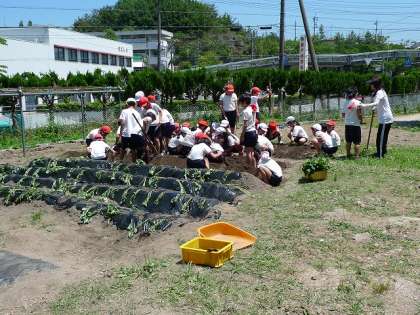 5月17日(金)の3時限、4年2組(担任:井上教諭)の子どもたちが体育館横の菜園で、サツマイモの畑作りに汗を流しました。