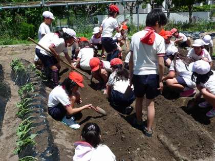 4年生は教師が耕して準備された畑に苗を植えるだけではなく、畝(うね)づくりから自分たちで取り組んでいます。