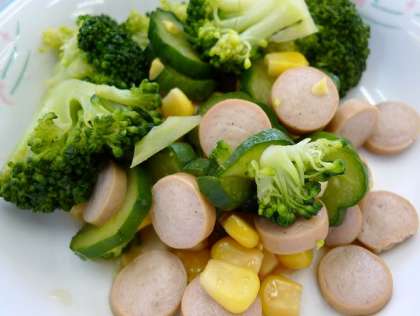 「ブロッコリーのサラダ」に使われているブロッコリーは、キャベツと同じなかまの野菜です。キャベツは“ 葉を食べる野菜 ”ですが、ブロッコリーは、“ 花のつぼみと茎(くき)を食べる野菜 ”です。半分に切るとよくわかりますが、小さなつぼみが固まりになって枝分かれをしています。