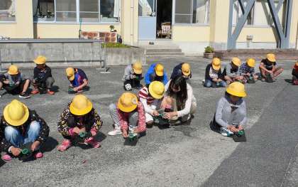 11月8日(金)の4時限、職員室前の広場で3年2組(担任:福井教諭)の子どもたちが、何かの活動に集中しています。しゃべり声も聞こえません。