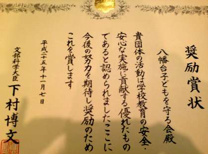 こうした毎日の活動が認められ、「八幡台子どもを守る会」がめでたく文部科学大臣表彰(学校安全ボランティア部門 “奨励賞”)をいただくことになりました。
