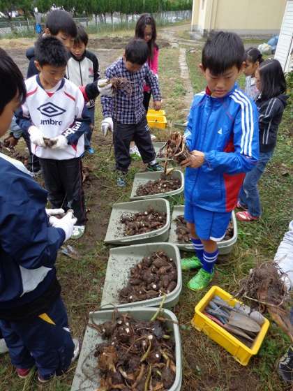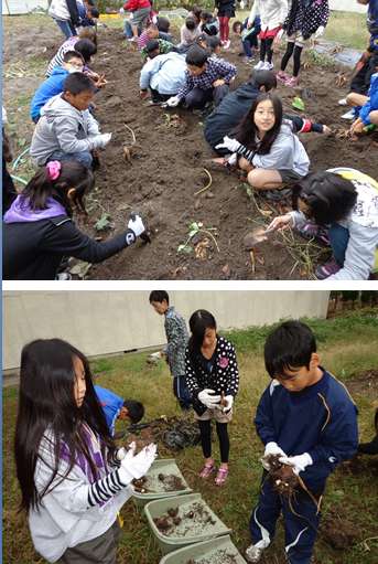 11月11日(月)の1時限に5年2組(担任:小山教諭)が里芋(さといも)の収穫を行いました。