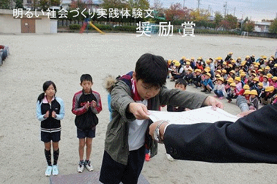 「明るい社会づくり実践体験文」の奨励賞を受賞した6名です。尾張旭市で行われた表彰式に出席したようすは当ホームページで紹介させていただきました。代表で井上くん(6年)が賞状を授与されました。
