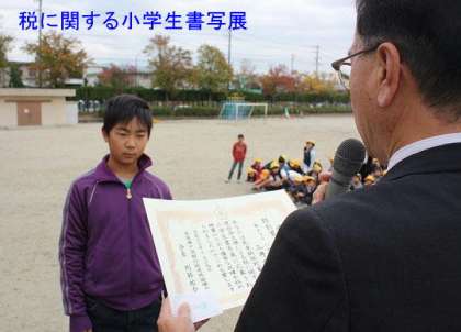 「税に関する小学生書写展」の受賞者は11名。代表で三井くん(6年)が賞状を授与されました。