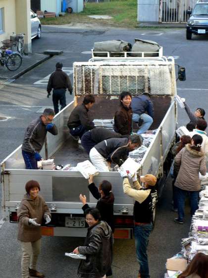 リサイクル活動当日は、登校時間の前にPTA会員や児童が集積場所まで資源物を運びます。そして、業者さんのトラックが学校のストックを回収した後、八幡台各地をまわって資源物を回収します。