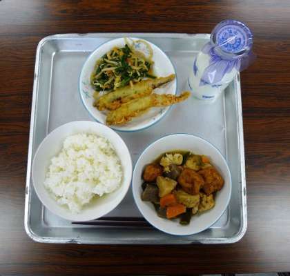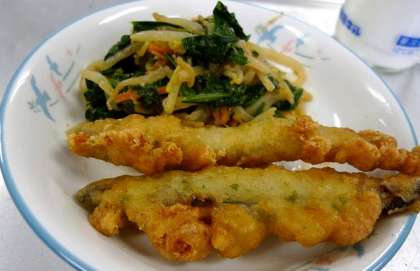 「ししゃもフリッター」が久しぶりに登場です。フリッターは、卵白をメレンゲにしたり、牛乳を混ぜたりして「ころも」を作ります。今日の「ししゃもフリッター」には「青のり」が入っていて、食べると、ぷ〜〜んと磯の風味がしました。