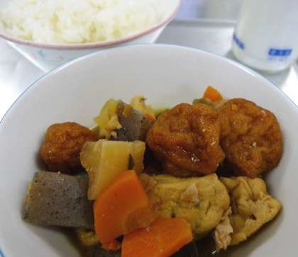 給食では、関東煮の「つゆ」の味がしみこんだ美味しい「がんも」をいただくことができました。