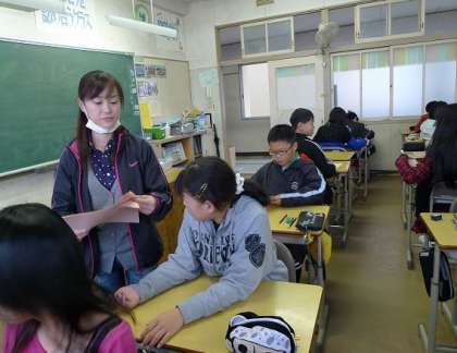 加藤教諭の指示で、子どもたちは“テスト隊形(?)”に机を移動します。それでも最後の抵抗とばかりに、練習プリントに目をやる子もいれば、緊張と不安からでしょうか