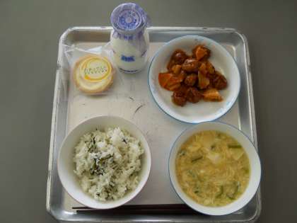 今日は、人気の「お米のタルト」(写真中)が出ました。喜んで食べた子も多かったと思います。1年生の先生の話では、ごはんもおかずもきれいに完食だったようです。