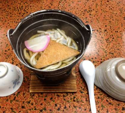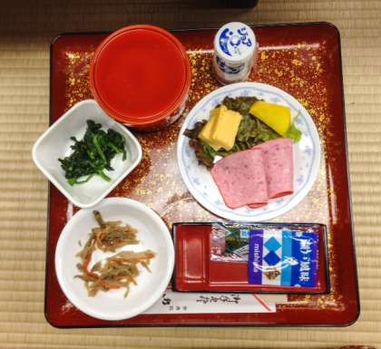 玉子焼き、ハム、レタス、おひたし、きんぴらごぼう、味付け海苔、ふりかけ、さらに、うどんもついてます。