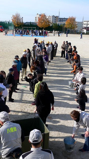 バケツリレーの訓練です。八幡小学校の子どもたちも参加していました。チームワーク、協力の気持ちが大切ですね。この後、消火器を使った訓練も行われました。