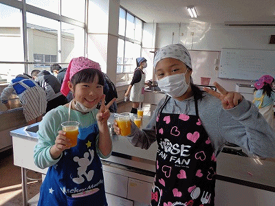 4年生がデザートの手作りに挑戦しました。缶詰のフルーツと紙パックジュースを使った、フルーツゼリーです。
