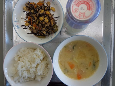 献立は、洋風団子汁、大豆の磯煮、麦ごはん、牛乳です。