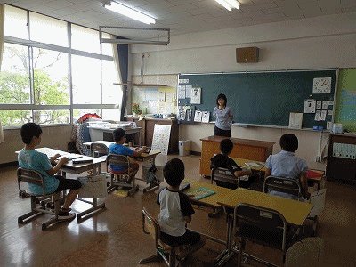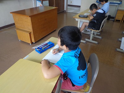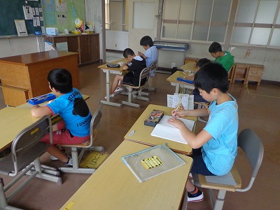 連絡帳を開いて、明日の予定を書いています。みんながんばっていますね。