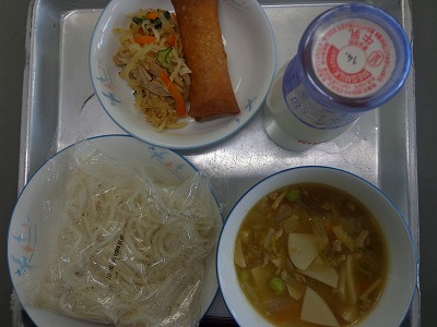 献立は、中華あんかけ、春巻き、切り干し大根サラダ、ソフトめん、牛乳です。