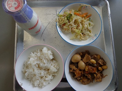 献立は、鉄火みそ、レンコンとキャベツのごま酢あえ、麦ごはん、牛乳です。