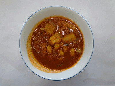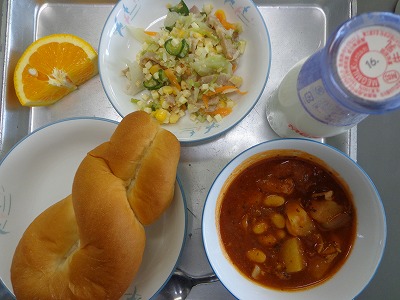 スクールランチメニューは、ポークビーンズ、イタリアンサラダ、クロスロールパン、ミルク、オレンジです。