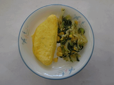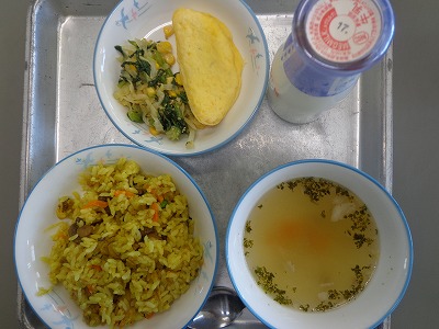 献立は、コンソメスープ、愛知のしらす入りオムレツ、小松菜のサラダ、カレーピラフ、牛乳です。