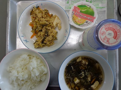 献立は、もずくのすまし汁、ゴーヤチャンプルー、ごはん、牛乳、そしてシークワーサーゼリーです。