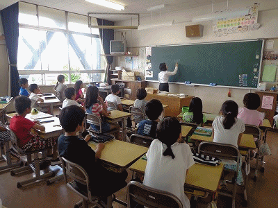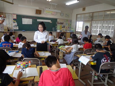 2組です。教育実習生の授業です。みんなで力を合わせています。