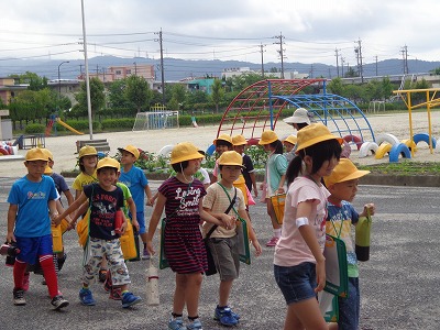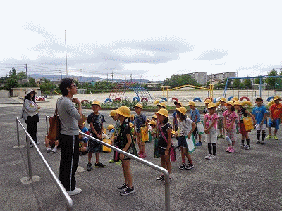 「えいえいおう」と、鬨(とき)の声をあげながら、校区探検に出かけました。