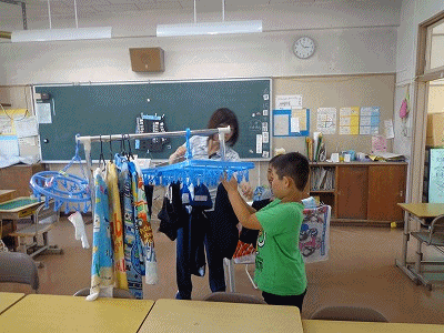 4年生は外で畑の作業、3年生は中で洗濯物を干します。