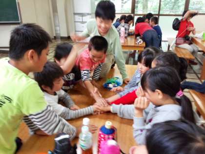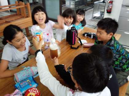 外は雨……でも、子どもたちは、お茶のシェイク、しっぺなど、工夫して遊んでいます。