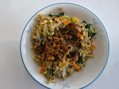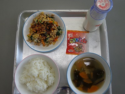 献立は、トックスープ、ビビンバ、ごはん、牛乳、アーモンド小魚です。