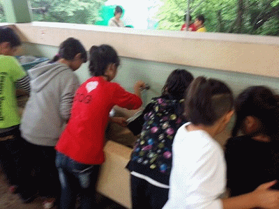 夕飯の片付けをしています。使ったはんごうやお鍋をピカピカに磨きます。