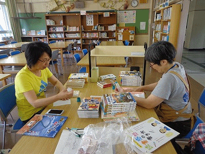 図書ボランティアの松田さんと塚本さんが、貸出期間票を糊付けして、配架の準備をしてくださっています。もう少しで貸出できます。お楽しみに。