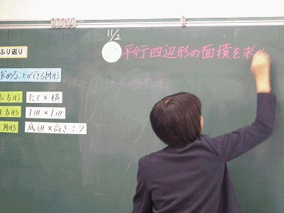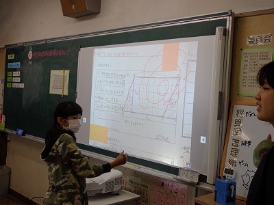 平行四辺形の面積の学習です。タブレットと短焦点プロジェクター、そしてアクティブラーニング・・・新しい息吹を感じます。