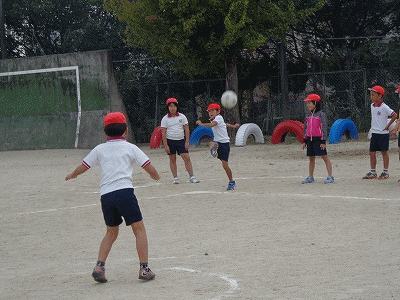 キックベースボールです。大きくけるのもいいですが、ちょこんと当てるだけもなかなかいい作戦です。