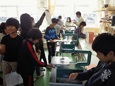 「糸のこのドライブ」の単元です。糸のこを使って、曲線を切っていきます。集中していないと、指まで切れてしまいます。慎重にゆっくり……