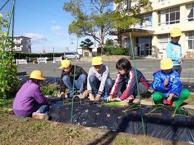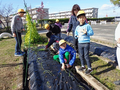 玉ねぎの苗を植えています。植え終わったら、合格の数を数えます。